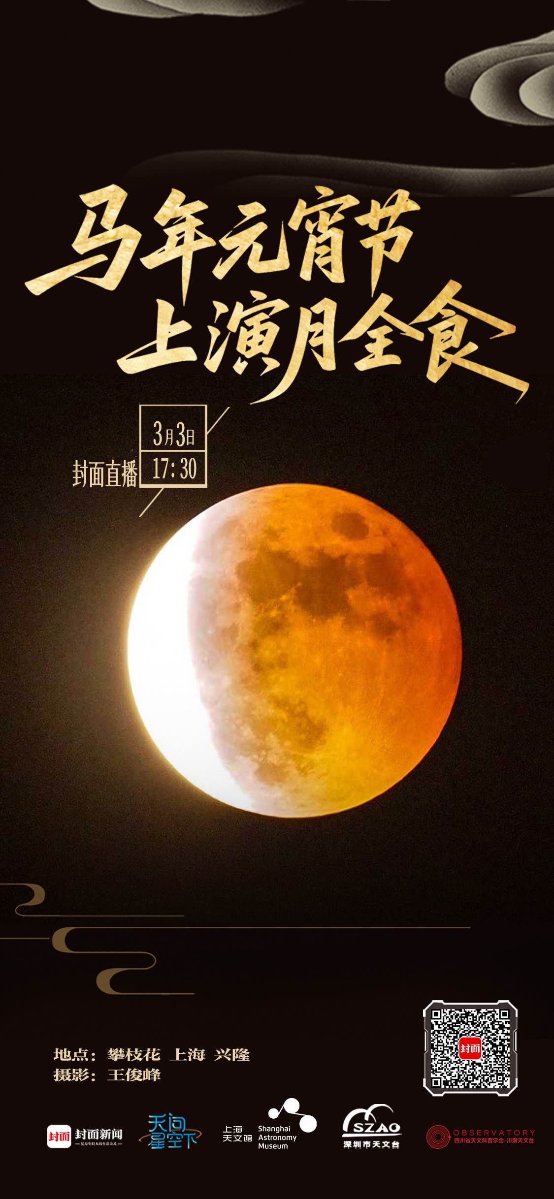 3月3日元宵夜,2026年度天象大戏-月全食将在我国多地上演。封面新闻联合上海天文馆、深圳市天文台、四川省天文科普学会·川南天文台,共同推出元宵节月食直播,全国网友可以从17:30起,通过封面直播一起云赏月。四川的朋友有望在19:30后看到月食后半程。
